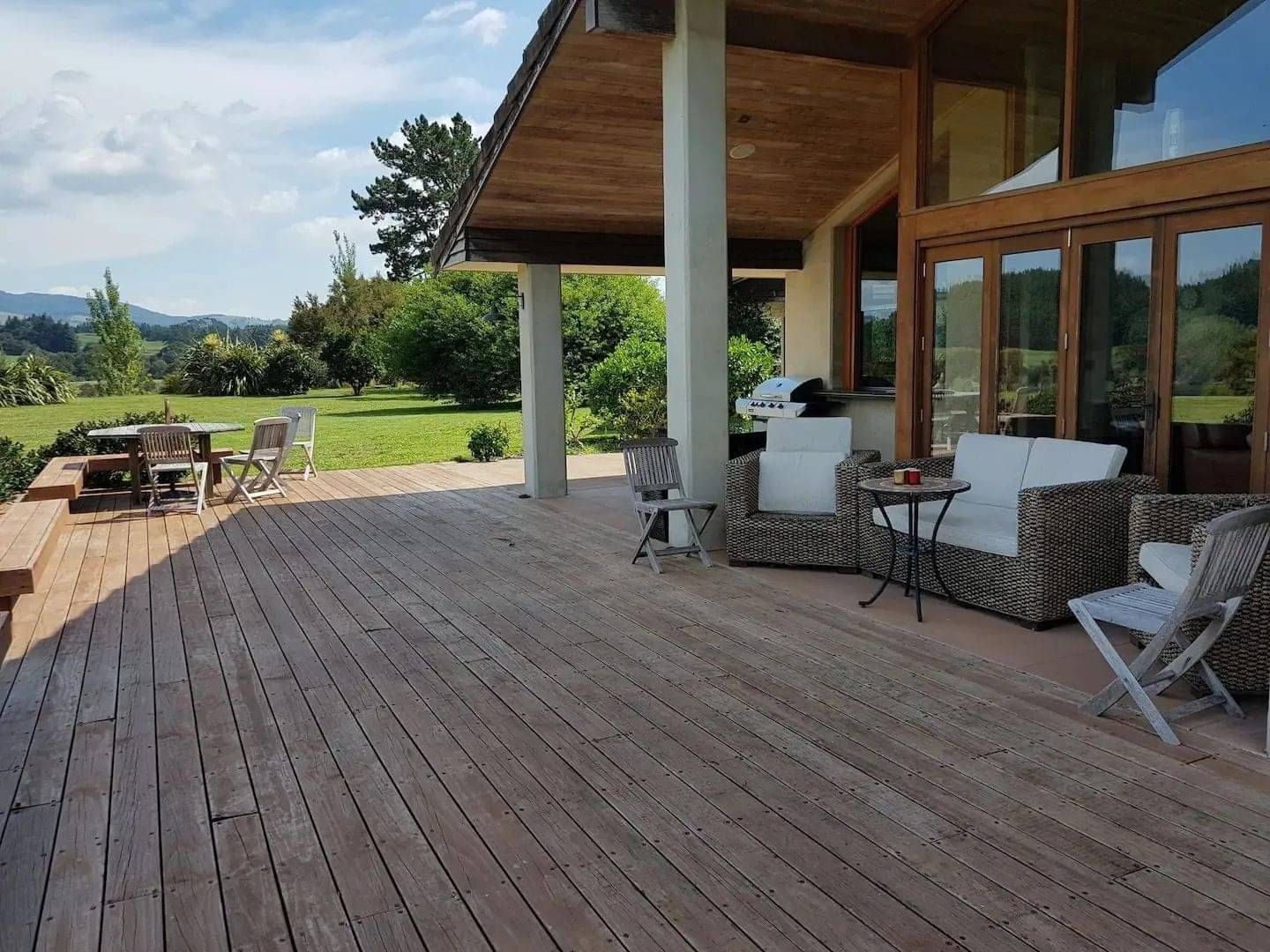 A large outdoor deck and flat grass area, which you can use at your leisure.