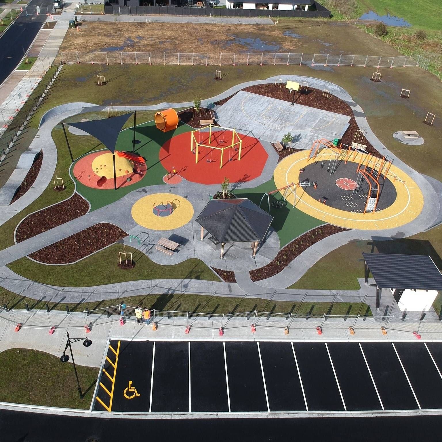 This playground has it all, swings, a hamster wheel, musical play, in-ground trampolines, a basketball half-court, a BBQ area and even fitness equipment for adults!