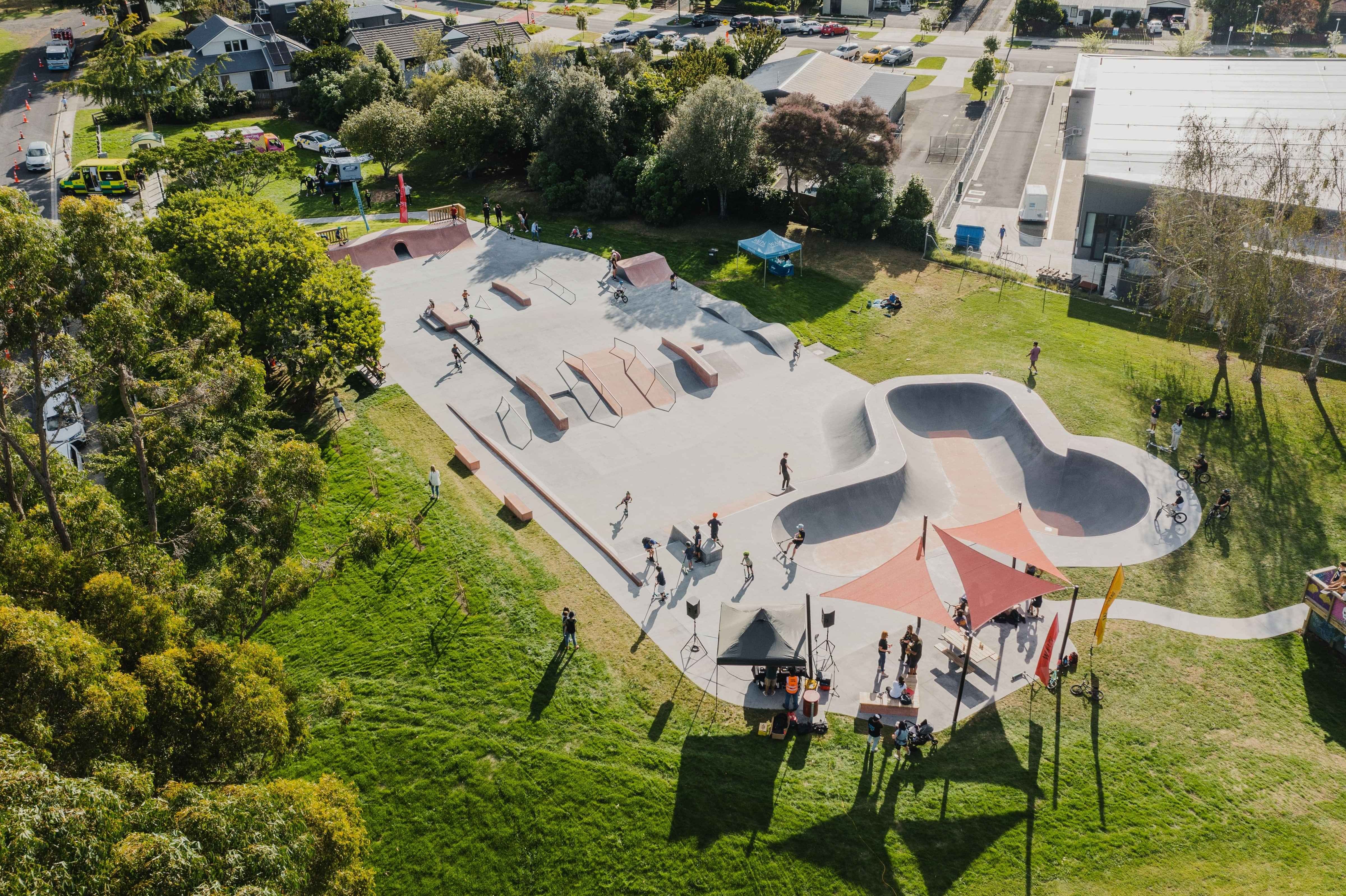 The park boasts multiple bowls, a wooden mini halfpipe, street sections with rails, ledges stairs and a mini ramp.