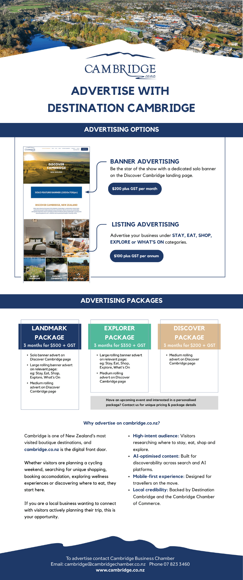 cambridge@cambridgechamber.co.nz or phone 07 823 3460